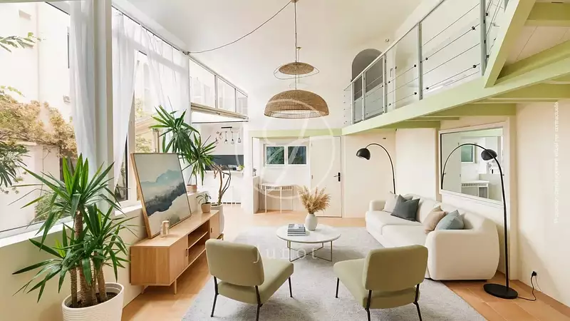 Ce bien très lumineux et bénéficiant d'une belle hauteur sous plafond d'environ 5 mètres est composé d'une entrée, d'une cuisine ouverte face à la terrasse, d'un séjour-salle à manger, d'une chambre et d'un bureau accessible par mezzanine, d'un espace bureau ou dressing, d'une salle de douche et de toilettes séparées.
