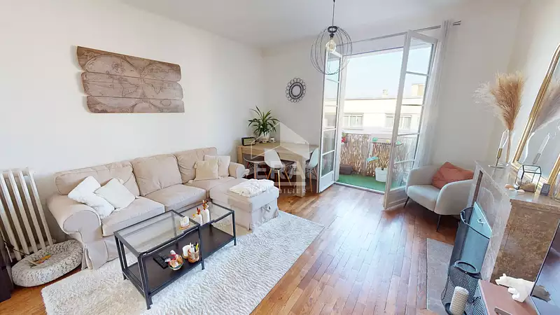 Il se compose d'une entrée avec placard, d'une cuisine entièrement aménagée et équipée, d'un séjour avec une jolie cheminée fonctionnelle, de deux grandes chambres de 16 et 17 m2, d'une salle de bains, de WC séparés et d'un balcon.