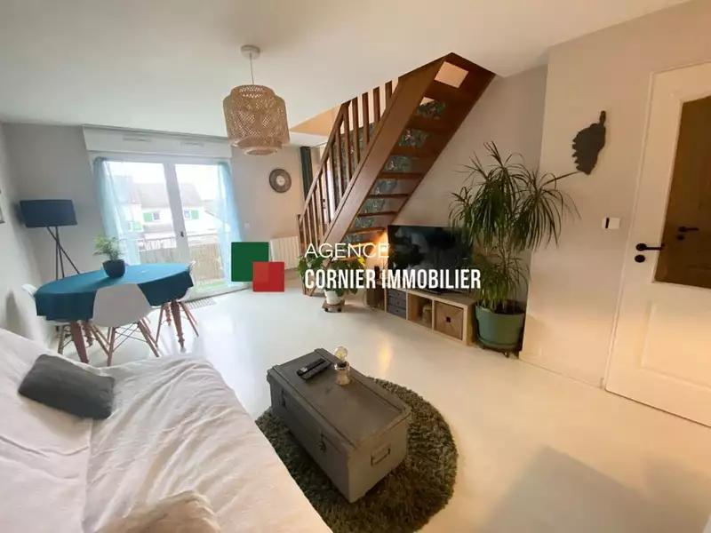 LA BOUEXIERE - Joli appartement T3 en duplex de 76.56m² habitables (78.94m² au sol), comprenant : une entrée avec placard, un WC séparé, un séjour avec balcon exposé sud-est, une cuisine séparée aménagée. A l'étage : un dégagement avec placards desservant deux grandes chambres dont une avec placard, une salle de bain spacieuse avec WC.