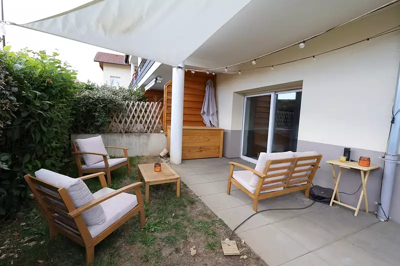 Au calme, dans une résidence construite en 2012, appartement de type 3 en rez de jardin d'une surface carrez de 76.20m2 composé d'un hall d'entrée, une belle pièce à vivre avec cuisine ouverte donnant sur terrasse et jardin, deux chambres, une salle de bain, des WC séparés. En annexe une cave et deux places de stationnement.