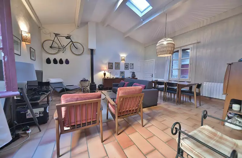 Dès l'entrée, le séjour offre un espace aux volumes hors du commun, belles hauteurs sous plafonds, baigné de lumière et donne accès à un espace cuisine parfaitement aménagée et équipée.