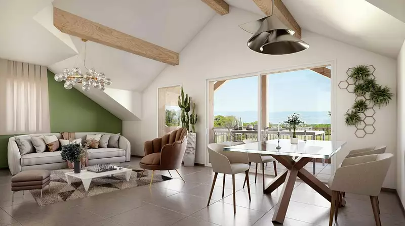 Situé à moins de 15 minutes d'EVIAN , au calme de FETERNES, au dernier étage d'un ensemble immobilier avec vue dégagée sur le lac, entouré de terrains agricoles, à proximité de l'école, des transports et d'un centre médical.