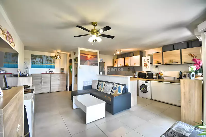 Bel espace à vivre avec cuisine ouverte : Idéal pour la convivialité et la modernité.