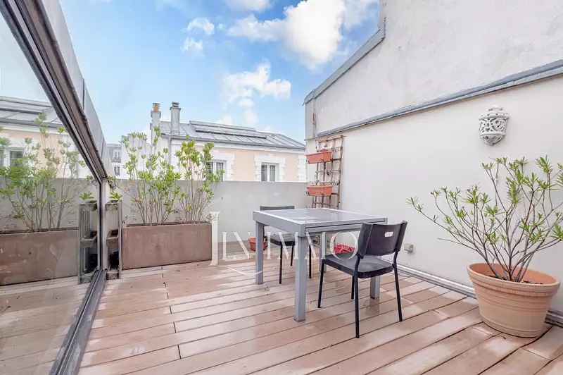 Situé au dernier étage d'un immeuble 1900/ 77,23 m2 au sol (60,95 m2 Carrez) oSublimé par une terrasse plein sud de 9 m2, sans aucun vis-à-vis, avec une vue dégagée sur les toits de Paris. L'appartement, seul sur son palier, bénéficie d'un accès privatif dès le 3ème étage, pièce de vie de 45 m2 , 2 Chambres climatisées (reversibles) Une chambre principale de 16 m2 avec rangements sur mesure, une deuxième chambre d'environ 9 m2. Une salle d'eau avec WC complète cet ensemble harmonieux. Une spacieuse cave de 10 m2 vient parfaire ce bien.