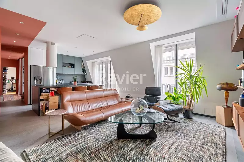 Au 6ᵉ étage avec ascenseur d’un très immeuble haussmannien restructuré, appartement 3 pièces de 77.14 m² (81 m² au sol), rénové par architecte avec des matériaux de qualité.