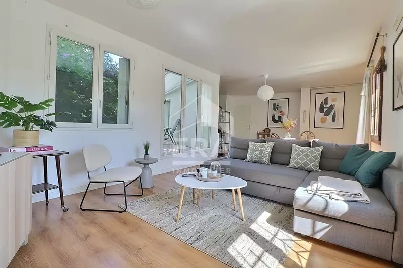 Le séjour lumineux, exposé plein sud, s'ouvre sur une magnifique terrasse de 60 m², parfaite pour profiter du calme environnant. La cuisine, entièrement aménagée et équipée, est vendue avec l'appartement. Deux grandes chambres avec rangements intégrés, une salle de bains et des WC séparés complètent ce bien.