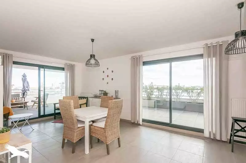 Île Sud, résidence de standing avec ascenseur, type 4 au 5è étage sur 7 de 77m², vues panoramiques sur le port, la mer et le mont Saint Clair, séjour/cuisine, 3 chambres, salle de bains et salle d'eau, wc séparé. 80m² de terrasses et un parking privatif complètent les prestations. Aucun travaux à prévoir.