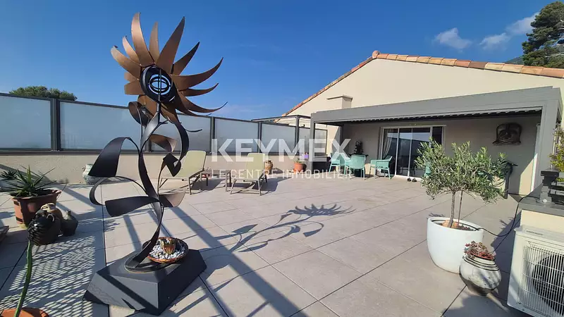TOULON EST - TOIT-TERRASSE EXCEPTIONNEL - 77 m² + 80 m² DE TERRASSE AVEC PERGOLA BIOCLIMATIQUE - 498 000 euros A découvrir sans tarder ! Dans une résidence récente (livrée en décembre 2022), fermée et sécurisée, superbe appartement en toit-terrasse de 77 m², prolongé par une terrasse exposée sud-est de 80 m² avec une pergola bioclimatique de 20 m² offrant un espace de vie supplémentaire utilisable toute l'année. Situé dans un quartier résidentiel en hauteur de Toulon Est, à proximité immédiate des commerces, écoles et transports, cet appartement séduit par sa luminosité, ses volumes généreux et sa vue dégagée. Il comprend un séjour spacieux et lumineux ouvert sur la terrasse, une cuisine moderne et équipée, deux chambres confortables, une salle d'eau et un WC indépendant. Les prestations sont récentes et haut de gamme : double vitrage, climatisation réversible, volets roulants électriques, matériaux modernes. Les plus : Résidence récente (2022), fermée et sécurisée Toit-terrasse de 80 m² exposé sud-est Véranda bioclimatique de 20 m² Appartement lumineux et traversant Box fermé + cave Quartier calme, recherché et proche commodités Prix de vente : 498 000 euros Secteur résidentiel dans les hauteurs de Toulon EST Bien rare sur le marché toulonnais ! Contactez Juliette CHAMP dès maintenant pour plus d'informations ou pour planifier une visite au 06.24.53.56.44. Copropriété de 40 lots (Pas de procédure en cours). Charges annuelles : 1815 euros.