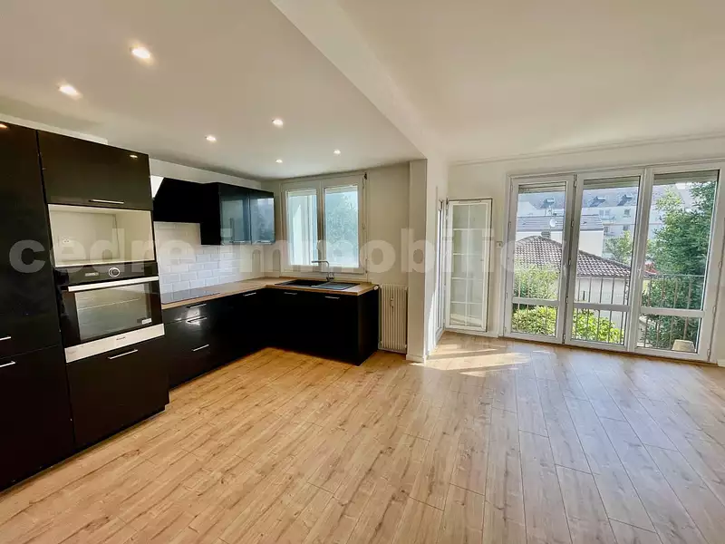 Lumineuse et spacieuse pièce de vie donnant sur balcon. Cuisine entièrement équipée et aménagée.