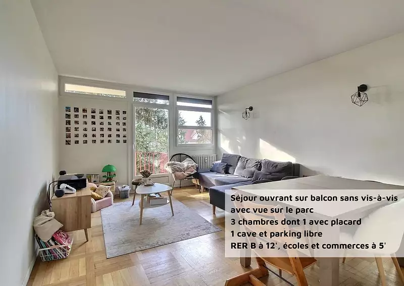 L'agence LOGISVERT vous propose EN EXCLUSIVITÉ un appartement 4 pièces à vendre à Palaiseau. CENTRE VILLE. Situé au 1er étage, appartement LUMINEUX d'environ 78 m² offrant: entrée avec placard, cuisine aménagée, SÉJOUR ouvrant sur BALCON sans vis-à-vis avec VUE SUR LE PARC (possibilité de faire un séjour double), salle de bains, WC indépendant et 3 chambres dont 1 avec placard. Une CAVE et un PARKING LIBRE complètent ce bien. BON ÉTAT GÉNÉRAL: peintures, parquet chêne, huisseries, tableau électrique refait, etc...). Ravalement voté + ITE + garde corps. PROCHE COMMODITÉS: écoles et commerces à 5' et RER B à 12' à pied.