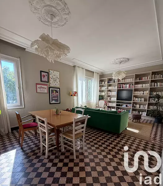 Beau hall central climatisé, desservant l’ensemble des pièces, la pièce de vie de 27m2, climatisée nous propose deux Bow Windows, un plafond haut, des moulures, un sol à damier d’origine, (si vous préférez le parquet une photo réalisée avec l’IA vous permettra de mieux vous projeter) une magnifique bibliothèque réalisée sur mesure qui apporte un cachet complémentaire à cette belle pièce ultra lumineuse exposée EST. Un espace salon cosy, et un espace salle à manger au charme fou.