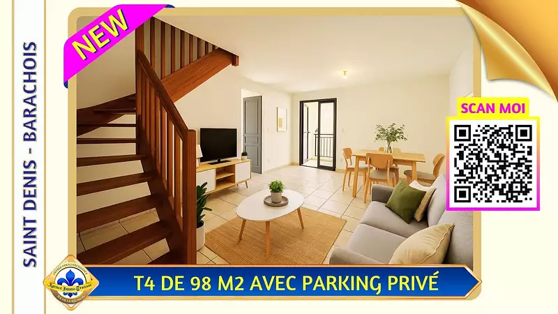 T4 À SAINT-DENIS AVEC TERRASSE : Un appartement T4 en DUPLEX de 91 m² habitables, situé au 3e et dernier étage d'une résidence de 2011 avec ascenseur, à deux pas du centre-ville.