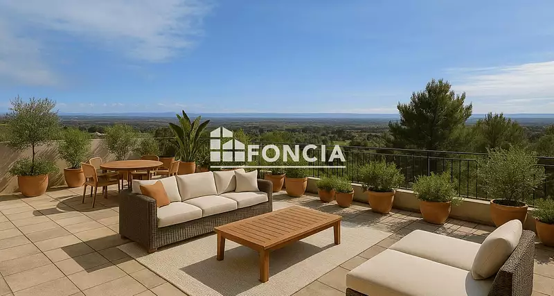 Le séjour, baigné de lumière, s'ouvre sur une spacieuse terrasse de 45 m², parfaite pour profiter pleinement des extérieurs. La cuisine est indépendante.