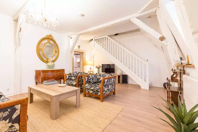 Il comprend : entrée directe dans le séjour salon, grande cuisine aménagée, une chambre spacieuse avec rangements, une salle de douches et un WC. A l'étage une 2è chambre.