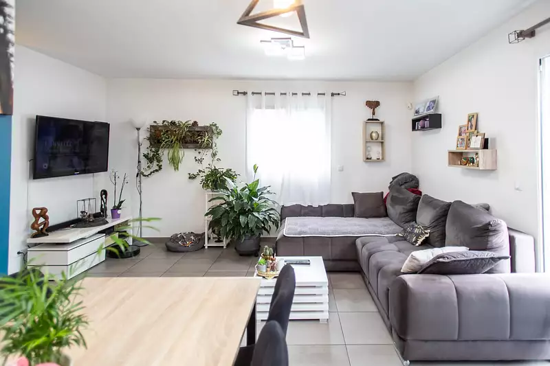 Le salon, baigné de lumière grâce à ses grandes ouvertures en PVC à double vitrage, donne accès à une terrasse de 35 m², idéale pour les dîners en plein air.