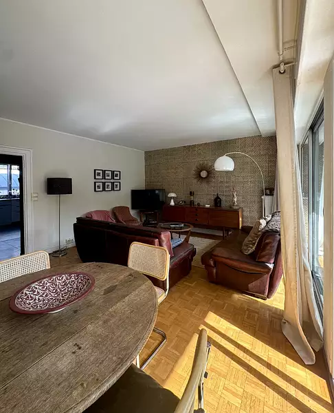 Une entrée, un séjour/salle à manger spacieux avec du caractère, lumineux exposé plein Sud, avec jolie vue sur la Seine.