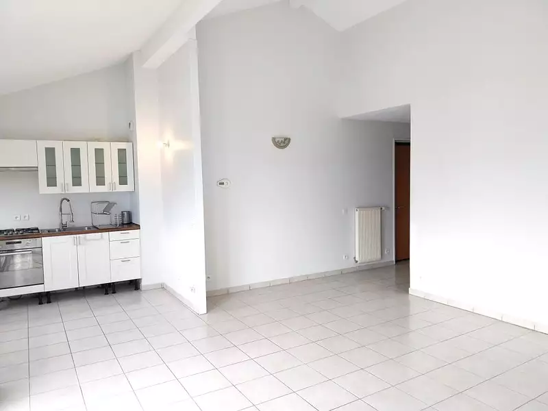 une entrée avec placard, une pièce de vie lumineuse avec plafond cathédrale et cuisine semi ouverte, un couloir desservant l'espace nuit composé de 2 chambres (17,33 et 14,54 au sol) , une grande salle de bains avec placard mural de rangement et un wc séparé.