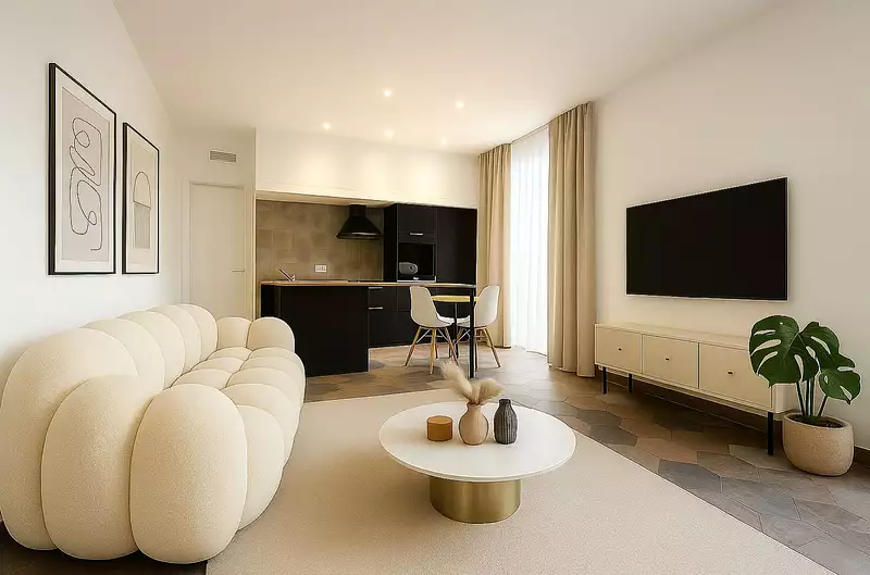 Cet appartement est composé d'une entrée, une cuisine équipée ouverte sur le séjour, deux chambres, une salle de bains avec les toilettes.