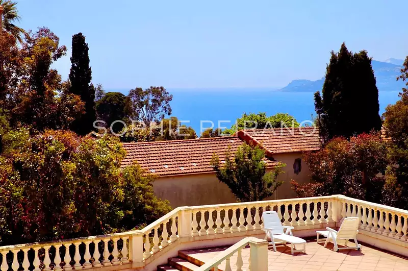 La pièce de réception lumineuse et sa cuisine équipée s’ouvrent sur une superbe terrasse de 90 m² ainsi qu’un jardin privé offrant une vue imprenable sur la mer.