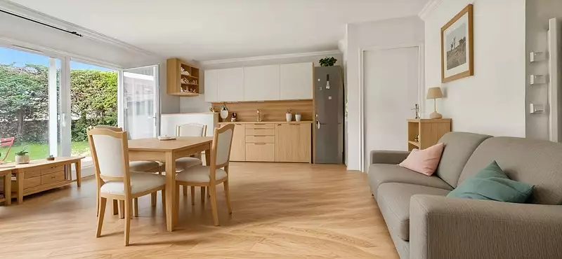 Dans le quartier du Jardin Parisien, au calme d'une impasse et proche de l'éco-quartier du Panorama avec son lac, ses commerces et ses restaurants, cet appartement traversant en rez-de-jardin offre un cadre de vie privilégié.