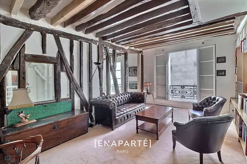 Paris 1er. Rue Saint-Honoré - Louvre - La Samaritaine. Situé au 3ème étage avec ascenseur d'un immeuble en pierres de Paris dans le « Village Saint-Honoré » très bien entretenu dont le ravalement des façades sur cours ont été réalisées et la cage d'escalier est en cours de refection. [EN'APARTÉ] vous propose ce 4 pièces composé d'une entrée, d'une pièce principale sans vis-à-vis et bénéficiant de bibliothèques sur mesure, d'une cuisine aménagée ayant un accès à une passerelle extérieure qui dessert un espace bureau, d'une grande chambre avec des placards intégrés dont le parquet a été changé et une salle de bain attenante et d'un toilette indépendant. Ce bien profite d'un environnement très calme sur deux cours. Ce bien à fort potentiel profite du charme de l'ancien avec ses poutres apparentes et ses tomettes. Une cave agrémente ce bien.