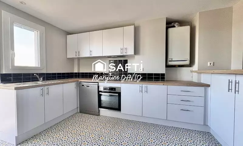 Vaste cuisine ouverte meublée et toute équipée avec plaque induction, lave-vaisselle, hotte aspirante, 1 salon/séjour, 3 chambres, 2 salles d'eau avec chacune une douche italienne + lavabo, wc et placards de rangement dans le couloir.