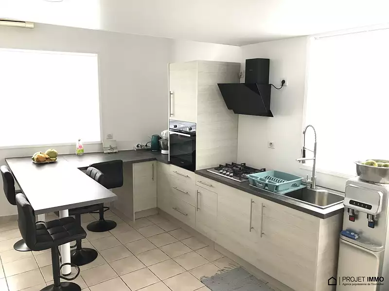 Cuisine entièrement équipée et aménagée, séjour, deux chambres et une salle d'eau, à l'étage une chambre avec sa salle d'eau.