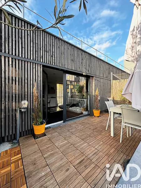 À l’étage, la pièce de réception baignée de lumière s’ouvre sur une cuisine contemporaine et se prolonge par une superbe terrasse plein sud, véritable rooftop à ciel ouvert, idéal pour recevoir ou se détendre en toute quiétude.