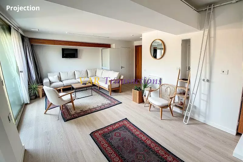 Vaste appartement bien agencé et climatisé de 77.5 m2 superficie loi carrez, 2 grandes chambres, double séjour de 34 m2 ouvert sur une terrasse avec une belle vue sur la rade, entrée avec dégagement, cuisine séparée ouverte sur une loggia fermée, salle d'eau avec douche, WC séparés... Double vitrage.