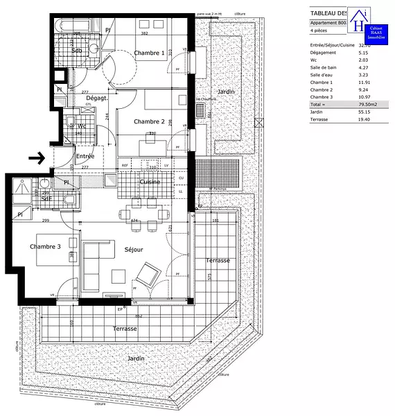 Dans le quartier de Champignol - HAAS vous propose à la vente un appartement de quatre pièces de 80 m² au rez-de-jardin, exposé sud, d'un immeuble de standing de 2024. L'appartement se compose d'une entrée séjour cuisine de 23 m², trois chambres dont une avec salle d'eau, une salle de bains, WC, un jardin de 55 m² et une terrasse de 20 m². Une cave et deux parking en sous-sol avec borne de recharge pour véhicule électrique complètent ce bien.