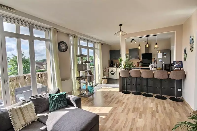 Cuisine ouverte équipée sur séjour avec grand balcon, 3 belles chambres spacieuses