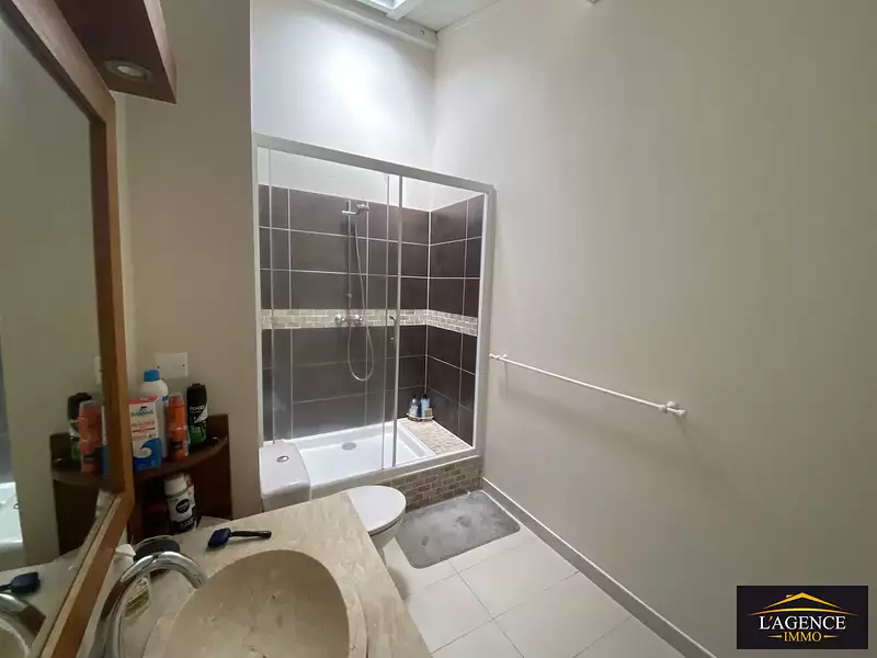 À l'étage, on retrouve une chambre avec placard et climatisation, disposant d'une salle d'eau et d'un WC privatifs, une family room également climatisée, ainsi qu'une terrasse 12 m2.