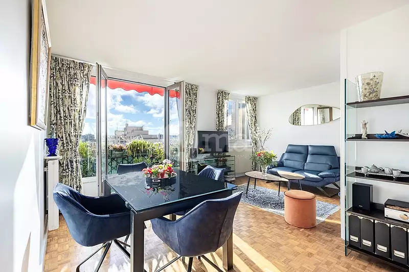 Appartement en duplex idéalement situé à proximité de la gare d'Asnières, des écoles et de toutes les commodités. Ce bien, situé au 8e et dernier étage avec ascenseur d'une résidence bien entretenue, avec gardien et espaces verts, il offre une vue imprenable sur Paris depuis son balcon exposé plein sud. Il comprend une entrée, un séjour double donnant sur le balcon, une cuisine aménagée (avec possibilité d'ouverture sur le séjour), deux chambres, dont une spacieuse avec salle d'eau et WC attenants, un bureau, un dressing, une salle de bains, ainsi qu'un WC séparé. En complément, l'appartement dispose de deux caves. Un coup de coeur, lumineux, bien situé, rare sur le secteur! (3.10 % honoraires TTC à la charge de l'acquéreur.) Copropriété de 215 lots - dont 100 lots habitation. (Pas de procédure en cours). Charges annuelles : 4200 euros.