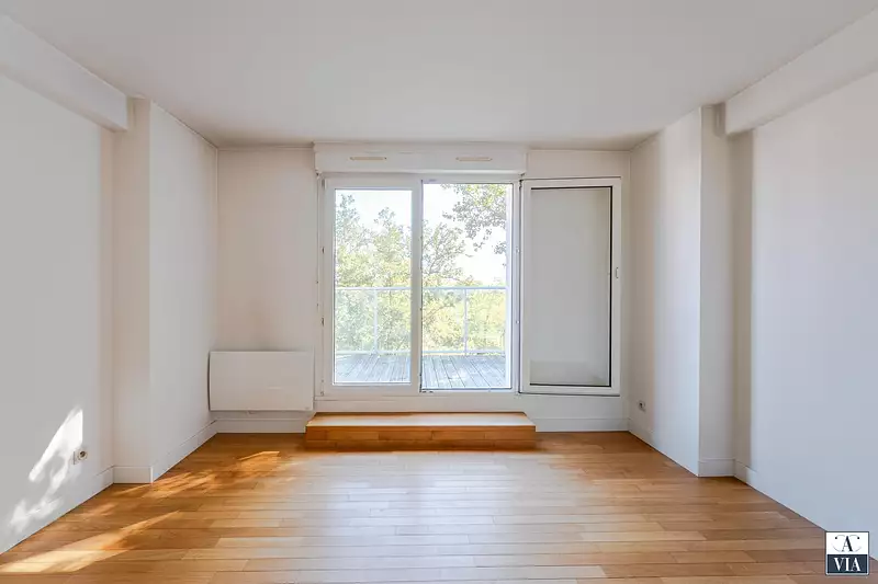L'entrée de l'appartement mène directement aux différents lieux de vie. La pièce maîtresse est le salon de 18 m² Carrez, dominé par les baies vitrées qui donne sur une terrasse à la vue dégagée, entourée de verdure et exposée ouest. Elle confère le sentiment de faire partie intégrante de la nature environnante. La cuisine séparée, de 17 m² Carrez, est également baignée de lumière grâce à ses nombreuses et jolies fenêtres en bois dont, une porte fenêtre qui mène à un deuxième balcon de plus de 7 m². Cet appartement offre la possibilité de profiter de trois chambres à coucher, respectivement de 11 m² Carrez pour deux d'entre elles et 12 m² Carrez pour la troisième, avec son accès direct au balcon. Sinon, les possibilités d'aménagement sont vastes. On peut par exemple abattre des cloisons pour créer des espaces plus grands, selon vos besoins. La salle de bains comprend une baignoire, idéale pour une famille, et dispose d'une fenêtre qui donne aussi sur une vue dégagée. Le WC est indépendant. L'appartement est en très bon état général, les menuiseries sont récentes et le beau parquet au sol d'origine lui confère beaucoup de chaleur et de cachet.