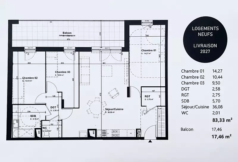 Au centre-ville de BOURGOIN-JALLIEU, proche de la gare et de toutes commodités. Dans une résidence neuve, appartement lumineux d'environ 83 m² comprenant : entrée, cuisine ouverte sur séjour donnant sur balcon d'environ 17 m², trois chambres, salle de bains et wc. Place(s) de parking et/ou garage(s) disponible(s) en sus. Normes de construction dernière génération. Economies d'énergie. Idéal pour les primo-accédants ! Prix : 289.000 euros