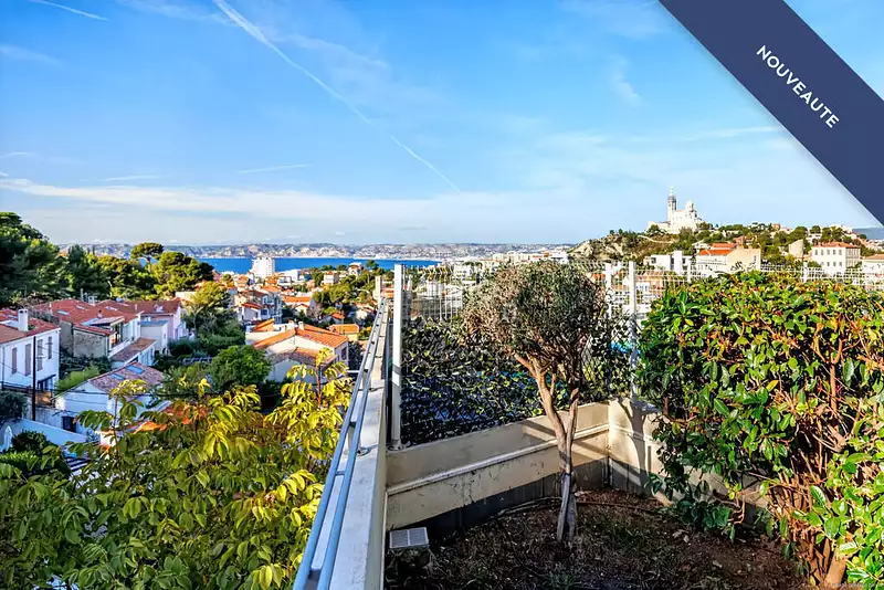 Il se compose d’une grande pièce à vivre s’ouvrant sur une terrasse de 13 m2, en partie couverte, exposée Ouest avec vue sur la mer et sur Notre Dame de la Garde.