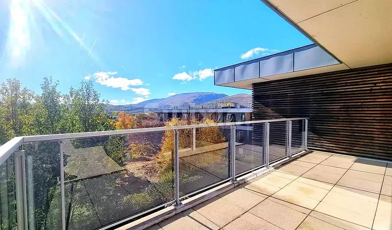 En attique avec ascenseur, ce T4 de 83,5 m² est lumineux par sa triple exposition et se prolonge sur sa terrasse de 66 m² avec vue parc, Salève et Mont-Blanc. La pièce de vie avec cuisine équipée profite de larges ouvertures sur la terrasse et sans vis- à-vis avec vue dégagée sur les chaînes de montagnes en fond.