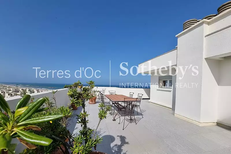 Magistrale terrasse de 110m² avec vue Canigou, étang et mer, pour ce beau duplex situé au dernier étage d'une résidence avec ascenseur et piscine.