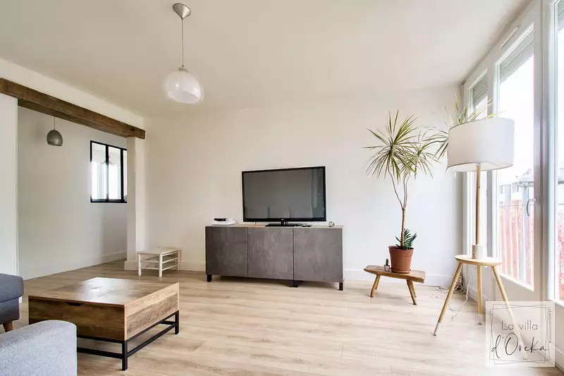 Par un léger dégagement optimisé, on découvre une chaleureuse pièce de vie en L avec parquet de 28,86m2, baignée de lumière grâce à de grandes ouvertures donnant une vue agréable sur la verdure et quelques toits d'échoppes bordelaises.