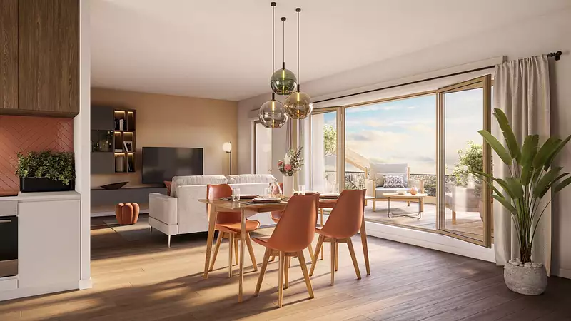 Grâce à deux grandes ouvertures donnant sur la terrasse sans vis à vis avec vue dégagée, cette pièce bénéficie d'une luminosité naturelle exceptionnelle, créant une ambiance conviviale et chaleureuse, idéale pour recevoir ou simplement se détendre chez soi.
