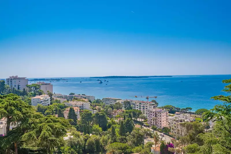 Dans une résidence de standing à seulement 300 m des plages, superbe appartement 3 pièces de 86 m² en étage élevé avec terrasse de 18 m² exposée sud offrant une vue panoramique sur la mer et la baie de Cannes.