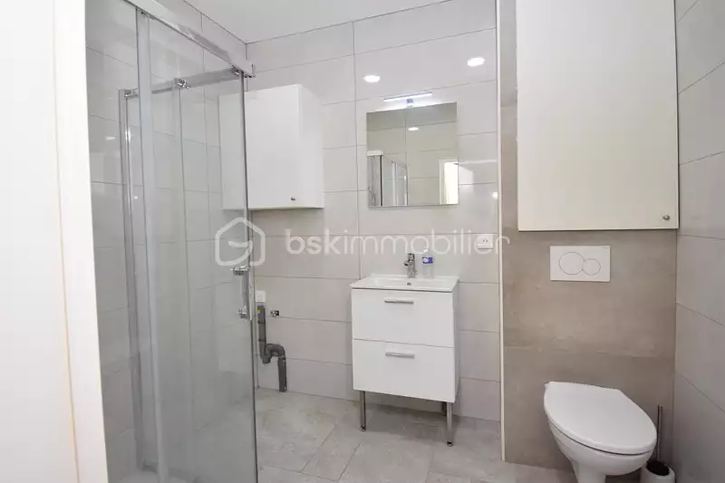 Appartement F2 de 32 m² : Une chambre, Cuisine ouverte sur séjour, Salle d'eau avec WC.