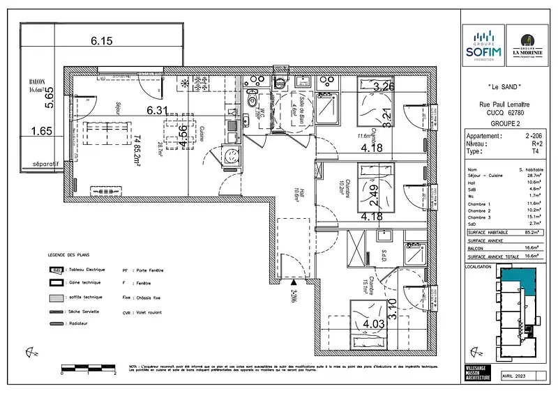 Nous vous proposons à la vente sur plan, cet appartement de type 4, au 2ème étage avec ascenseur, exposé sud-ouest, comprenant un hall d'entrée (10.6 m²), un séjour-cuisine (28.7 m²), une salle de bains (4.6 m²), un WC (1.7 m²), 3 chambres (11.6 m², 10.2 m², 15.1 m²), une salle de douche (2.7 m²), un balcon (16.6 m²), un parking. « Les informations sur les risques auxquels ce bien est exposé sont disponibles sur le site Géorisques : www.georisques.gouv.fr ».
