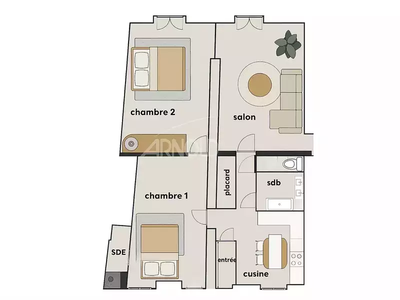 Il se compose d'une entrée, une belle pièce de vie, une cuisine, deux chambres dont une avec salle d'eau attenante, et de nombreux rangements.