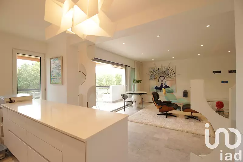 La pièce à vivre, lumineuse et agréable, donne accès à une spacieuse terrasse avec une vue splendide sur les platanes du Cours Palmarole. La cuisine américaine, entièrement équipée et aménagée, s’intègre parfaitement à l’espace de vie.