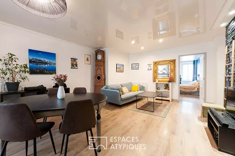 Niché au coeur d'un immeuble à la façade Art déco en plein centre d'Evian, cet appartement de 86 m², repensé avec soin en 2022, conjugue rénovation contemporaine et cachet de l'ancien dans une atmosphère apaisante. Dès l'entrée, le ton est donné : la pièce de vie baignée de lumière s'ouvre sur un volume surprenant, sublimé par un plafond en toile tendue blanche qui accentue les perspectives et invite à la contemplation. Une cuisine ouverte et parfaitement équipée prolonge la pièce de vie, donnant accès à deux espaces extérieurs : un balcon à l'abri des regards pour les petits-déjeuners paisibles, et une terrasse plein sud, idéale pour prolonger les soirées d'été. L'espace nuit dévoile deux chambres généreuses de 20 m² et 18 m², parquetées de bois clair, en parfaite harmonie avec l'ambiance douce et feutrée des lieux. L'une d'elles révèle une cheminée en pierre d'époque Louis XV, véritable clin d'oeil au passé et pièce maîtresse de cet écrin raffiné. Une salle de bains fonctionnelle avec coin buanderie ainsi qu'une cave complètent ce bien. L'appartement, entièrement rénové (menuiseries, isolation, agencements), s'inscrit dans une copropriété entretenue avec soin, dont la façade et la toiture ont été refaites en 2020. Situé à cinq minutes à pied du débarcadère et à dix minutes de la gare, cet appartement séduit par son emplacement privilégié en plein centre-ville. Une double entrée côté commerces et côté sources en fait un lieu de vie aussi pratique qu'agréable. Ce bien rare offre une alliance subtile de caractère, de confort et de singularité. Soumis au statut de la copropriété : 6 lots dont 3 lots d'habitation. Pas de procédure en cours. CLASSE ENERGIE : C / CLASSE CLIMAT : A Montant moyen estimé des dépenses annuelles d'énergie pour un usage standard, établi à partir des prix de l'énergie indexés sur les années 2021, 2022, 2023 : entre 770 à 1.070 euros. Les informations sur les risques auxquels ce bien est exposé sont disponibles sur le site Géorisques : www.georisques.gouv.fr Contact : Karine 06.14.98.51.52 Copropriété de 6 lots - dont 3 lots habitation. (Pas de procédure en cours). Charges annuelles : 800 euros. Karine ZEGRIR (EI) Agent Commercial - Numéro RSAC : 912 532 421 - THONON LES BAINS.
