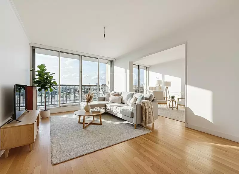 Situé au 7 étage, cet appartement 4 pièces de 86,36m² loi Carrez se compose d'une entrée avec placard, d'une cuisine indépendante aménagée (possibilité d'ouverture sur le séjour, mur non porteur), d'un double séjour / salle à manger lumineux donnant sur balcon, d'un dégagement avec nombreux placards et un petit dressing, de deux chambres avec balcon, d'une salle d'eau, d'une salle de bain et d'un WC indépendant.