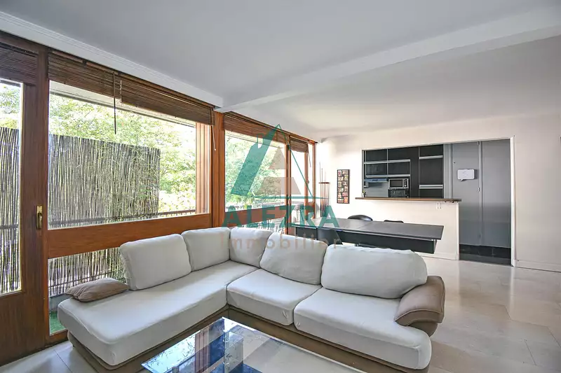 Situé à l'arrière de la résidence, au calme et dans la verdure, appartement familial de 87,63m2 en PARFAIT état. Il se compose d'une entrée donnant sur un séjour double avec balcon, une cuisine aménagée ouverte, trois chambres sans aucun vis à vis, une grande salle de bains avec une baignoire balnéo, une salle de douches / buanderie. Une cave dans le même bâtiment. Au pied de l'immeuble, un garage fermé en option du prix.
