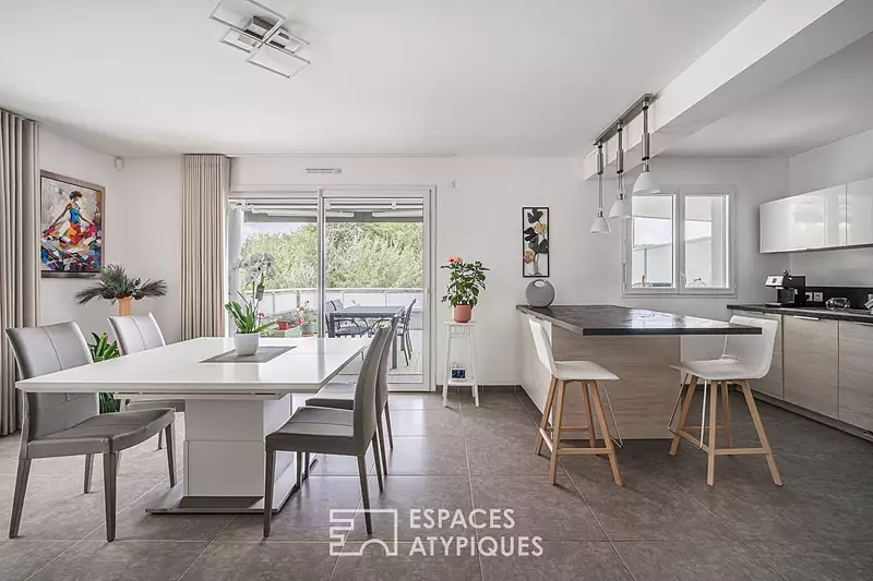 A Uriage, niché au creux d'un vallon classé en zone naturelle sur cette commune prisée du massif de Belledonne, en rez-de-chaussée surélevé, cette adresse confidentielle dissimulée aux regards abrite un appartement traversant et lumineux de 87 m2 et une double terrasse d'une surface presque équivalente ouverte sur la nature. Ce bien rare et singulier dans une jolie copropriété construite en 2017 et accessible PMR, séduit par sa situation et conjugue confort et environnement verdoyant, dans un cadre unique. L'entrée dessert une vaste pièce de vie baignée de lumière grâce à ses baies vitrées orientées vers les terrasses au sud et à l'ouest. Avec son séjour confortable et sa salle à manger, la cuisine ouverte aux lignes simples et contemporaines trouve naturellement sa place dans cette pièce à vivre lumineuse et conviviale. Ces espaces ouvrent sur la terrasse semi-couverte de plus de 76 m², sans vis-à-vis, entièrement tournée vers la nature environnante, véritable atout pour profiter des beaux jours en toute intimité. L'espace nuit côté Est se compose de deux chambres aux volumes confortables avec de confortables rangements intégrés. La salle d'eau, fonctionnelle, développe un esprit sobre et épuré. L'appartement bénéficie également d'un garage double fermé, proposé en sus. A quelques minutes de la rocade sud et de la gare, à 4 mn des Thermes d'Uriage, des écoles et des commerces et à 20 mn de la station de ski de Chamrousse, cet appartement ravira les amoureux de sport et de nature. Chauffage et eau chaude collectifs par chaudière à pellets Bien soumis au statut de la copropriété : 18 lots d'habitation Pas de procédure en cours Charges annuelles Eau chaude et chauffage inclus: 2.900 euros Taxe foncière : 2.014 euros CLASSE ENERGIE : B/ CLASSE CLIMAT : .A Montant moyen estimé des dépenses annuelles d'énergie pour un usage standard, établi à partir des prix de l'énergie de l'année 2021, 2022, 2023 : entre 790 euros et 1 110 euros Les informations sur les risques auxquels ce bien est exposé sont disponibles sur le site Géorisques : www.georisques.gouv.fr Contact : Marie-Laure - 06 84 97 46 73 Agent commerciale indépendante - RSAC Grenoble 890 478 670 Copropriété de 18 lots. Charges annuelles : 2900 euros. Marie-Laure MAVIC (EI) Agent Commercial - Numéro RSAC : 890478670 - GRENOBLE.