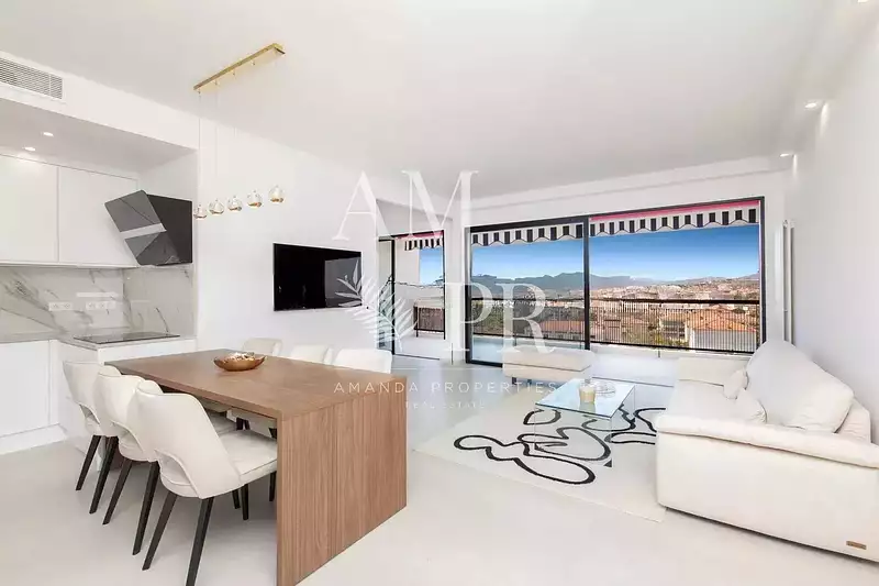 Amanda Properties vous propose dans le centre-ville de Cannes, au dernier étage d’une résidence de standing sécurisée avec parc, ce superbe appartement 3/4 pièces d’environ 90 m² bénéficie d’une situation calme et sans vis-à-vis. Entièrement rénové, il offre des prestations de qualité et des finitions soignées. Le séjour lumineux, prolongé par une terrasse de 20 m², jouit d’une vue panoramique sur la ville, la mer et l’Esterel. Une terrasse toit de 90 m² avec une vue 360° exceptionnelle sur la mer, l’Esterel, la ville et les collines vient compléter cet ensemble rare. L’appartement comprend une entrée, un spacieux séjour double (possibilité de 3e chambre), une cuisine moderne ouverte, deux chambres en suite avec salle d'eau et salle de bain, un WC invité, des dressings, un espace buanderie et de nombreux rangements. Il est vendu avec un garage en sous-sol, une cave et des places de parking. À deux pas de tous les commerces, vous apprécierez le plaisir de tout faire à pied.